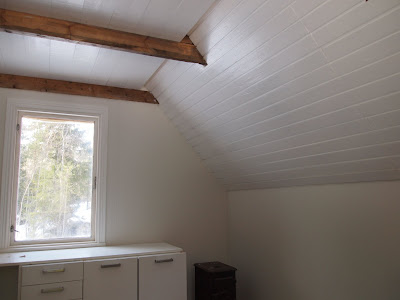 Vi rev ut vinden för att få högre i tak. Takbjälkarna har vi låtit vara omålade.